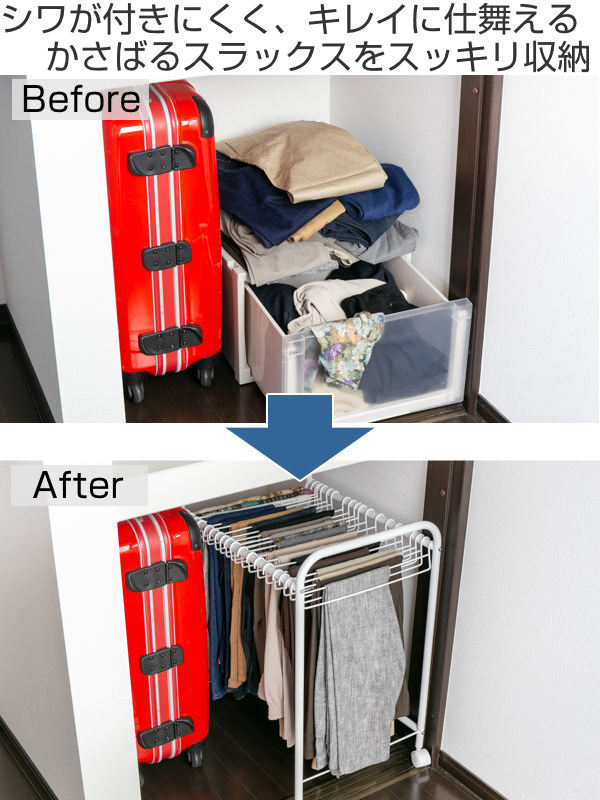 また、畳んで収納するとどうしてもシワが付いてしまうパンツ類も、掛けることでシワが付きにくくキレイなまま保管が可能です。